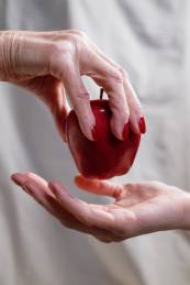 person holding red heart shaped ornament