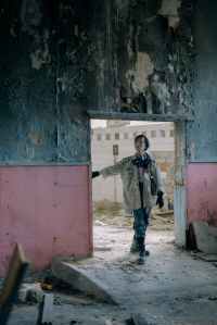 boy in gray jacket standing near red door