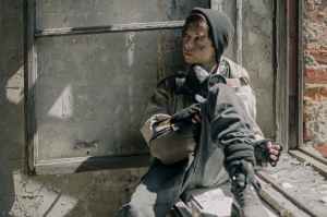 woman in black and white camouflage jacket and black knit cap sitting on concrete bench August 9, 2020August 9, 2020