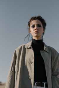 woman in black turtleneck shirt and gray coat
