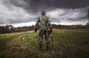 man in camouflage suit holding shotgun