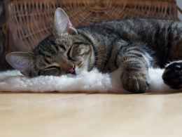 brown tabby cat lying on shag rug