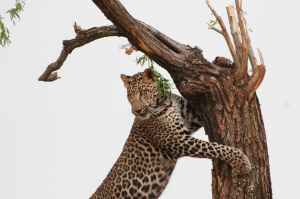 leopard leaning on tree