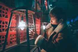 man wearing brown and gray coat reaching white and black light bulb