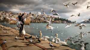 woman wearing black jacket standing near ocean with swan and birds