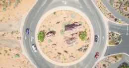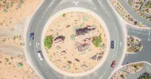 aerial photo of four cars on round about at daytime