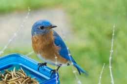 selective focus photography of blue and brown bird on blue glass canister
