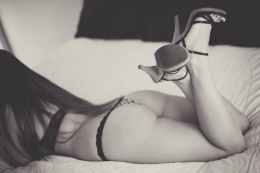 monochrome photo of woman laying on bed