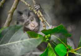 gray monkey holding on gray tree branch