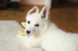 short coated white dog on white textile