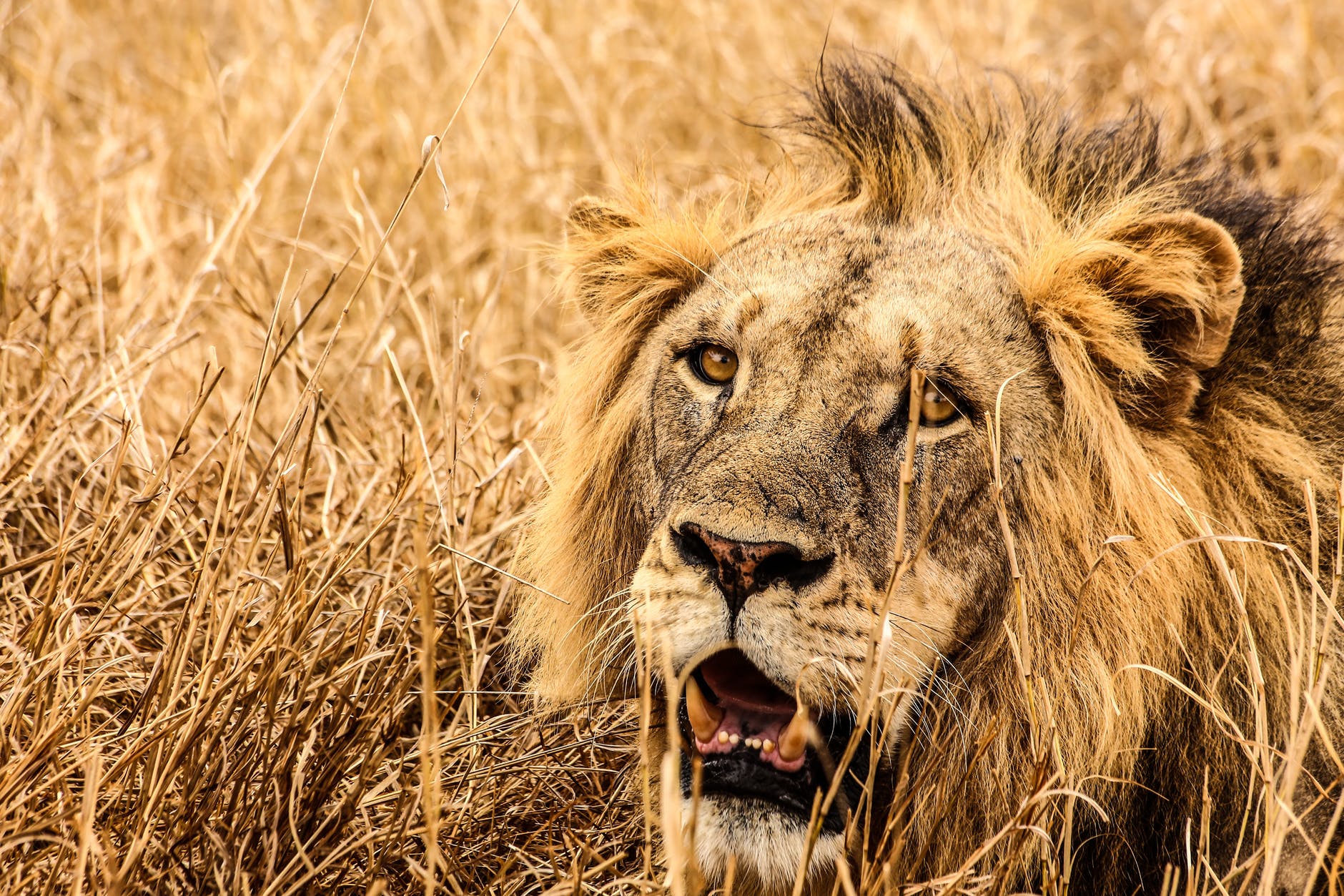male lion on brown fields