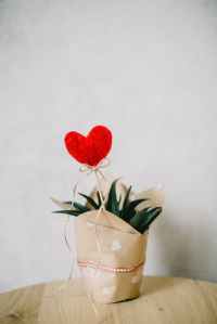 red heart ornament and aloe vera plant covered with paper