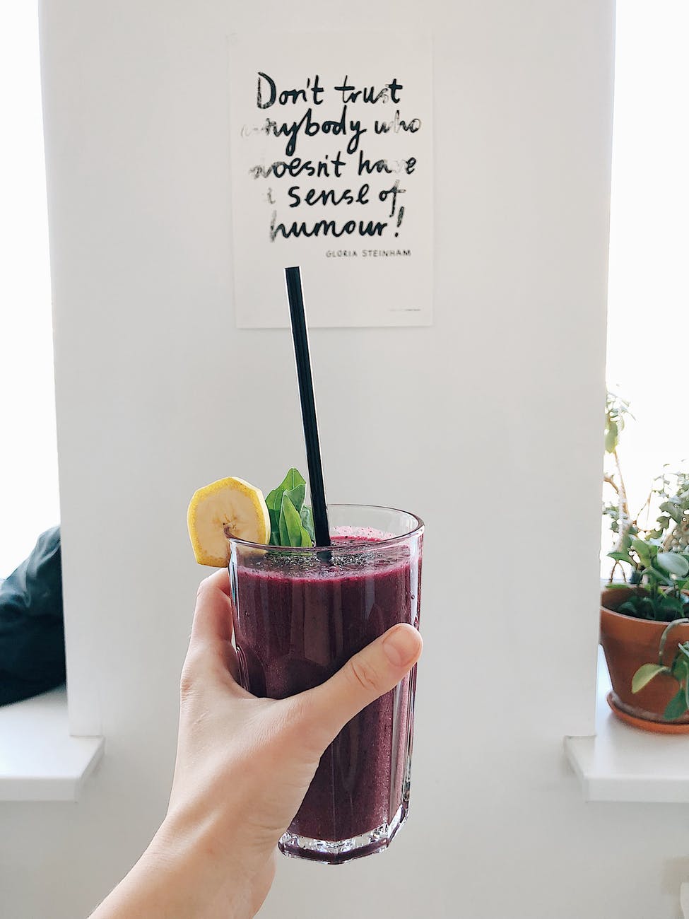 person holding clear drinking glass with purple smoothie with quotation decor March 13, 2020March 13, 2020