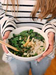 woman in white and black striped sweatshirt holding filled white ceramic bowl