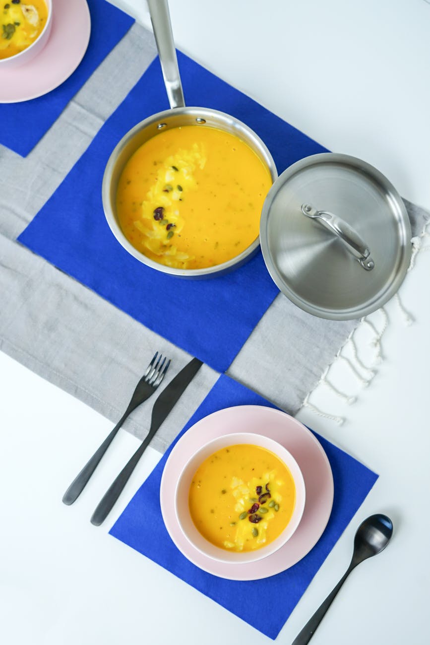 gray metal cooking pot with cook food beside bowl and cutlery set on top of table