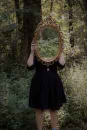 woman holding mirror against her head in the middle of forest