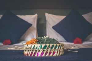 white and green table decoration near two black pillows